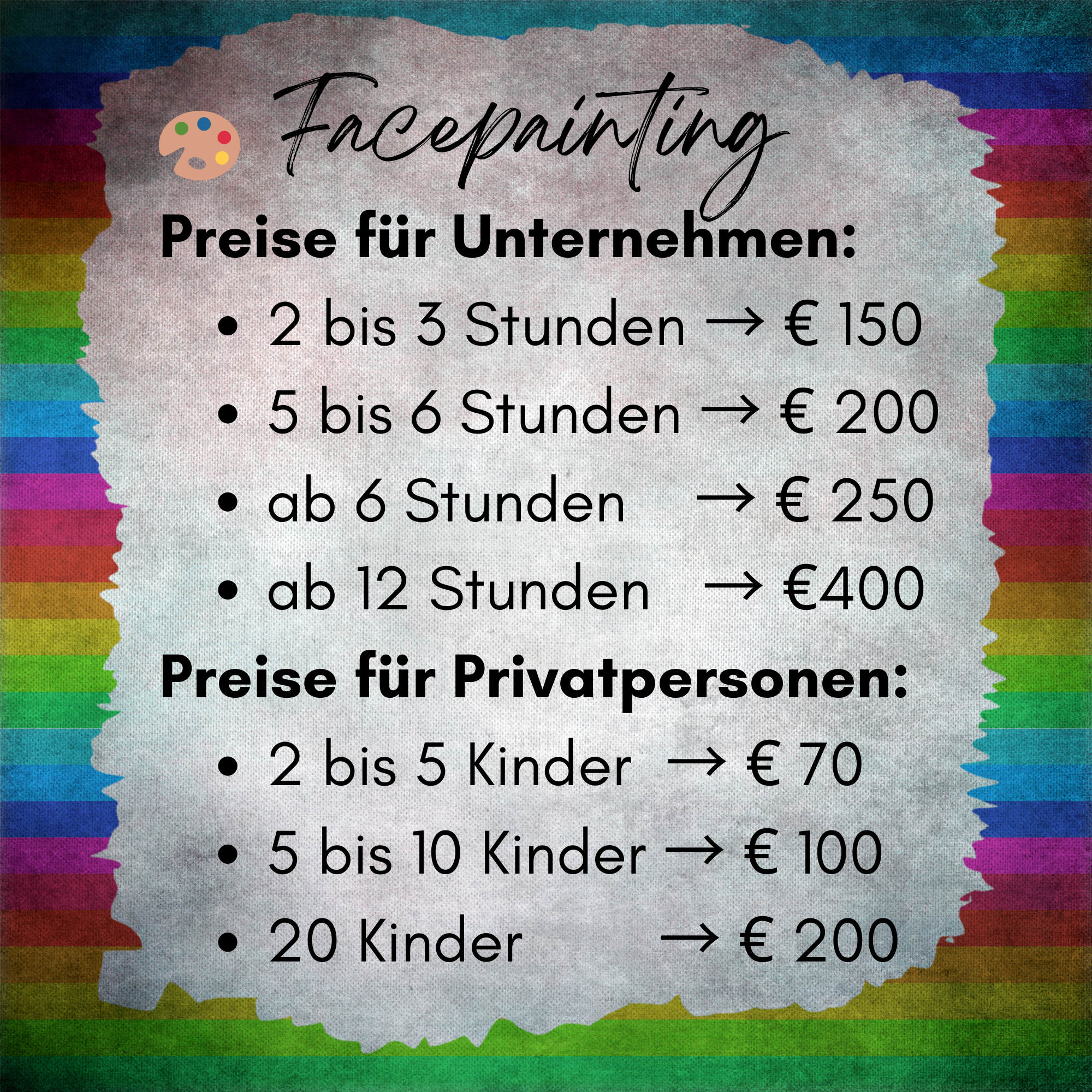 ‼️Ich verwende ausschließlich hautverträgliche, dermatologisch getestete Farben die speziell für Kinderschminken geeignet sind und mit Wasser und etwas Seife leicht abwaschbar sind. Bitte informieren Sie mich, wenn ihr Kind Allergien oder empfindliche Haut hat. Aus hygienischen Gründen kann ich keine Kinder mit Hautproblemen, Wunden oder ansteckenden Krankheiten schminken. Gerne biete ich im Gegenzug ein Motiv auf die Hand oder den Arm an.