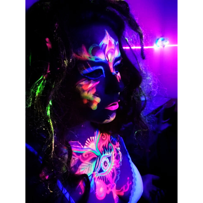 Die Farben enthalten fluoreszierende Pigmente, die das UV-Licht reflektieren und dadurch anfangen zu leuchten. Diese Farben sind oft auf Wasserbasis, ungiftig und hautfreundlich – speziell für die Anwendung auf der Haut entwickelt. ✨